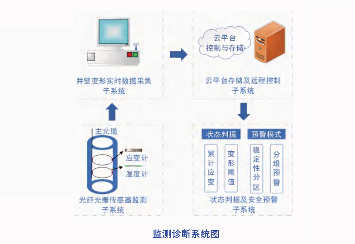 通過在井壁和罐道上安裝光纖傳感器,并與監(jiān)測室中光纖解調儀相連,采集井壁和罐道變形的環(huán)向應變和軸向應變數據,實現井壁和罐道變形的實時監(jiān)測。