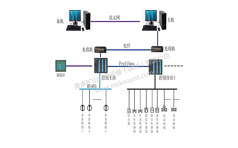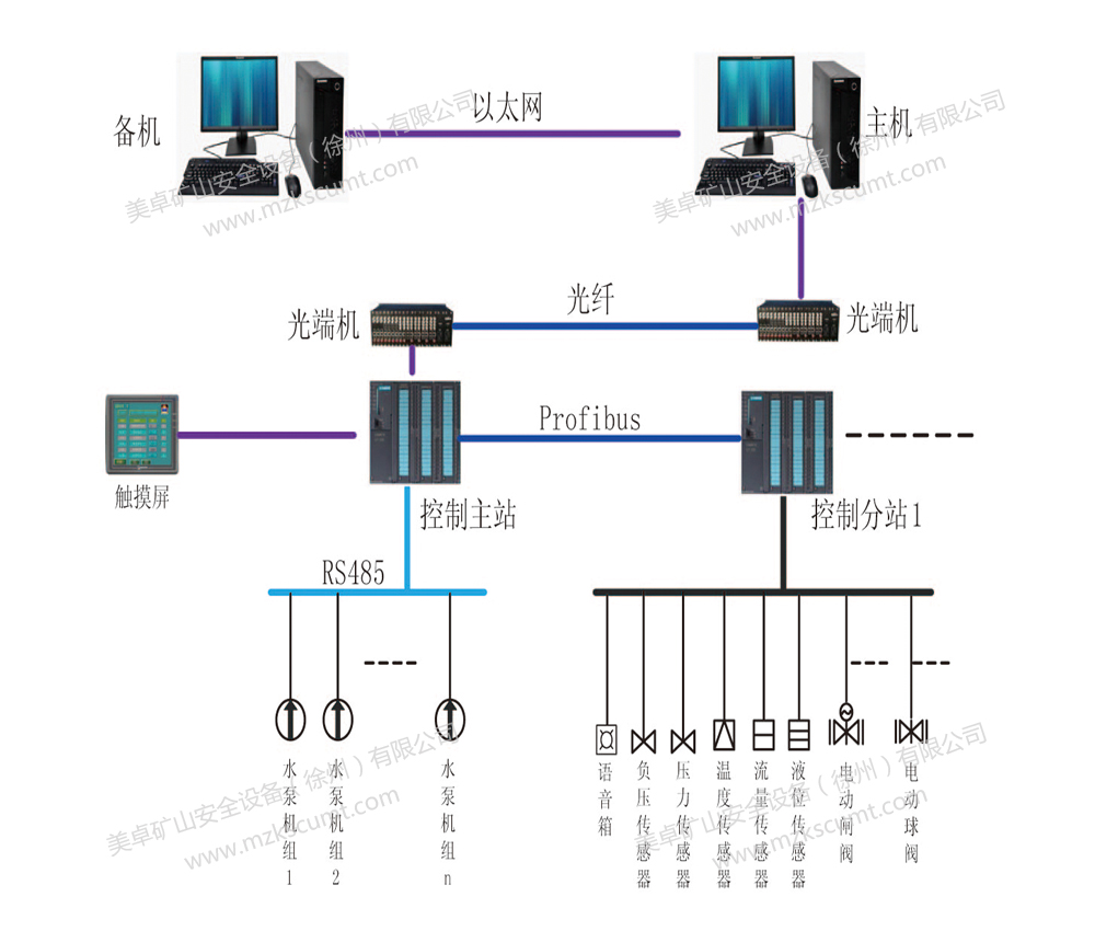 目前煤礦井下排水系統多采用手動直接控制,水泵的開停及選擇切換均由人工根據目測的水位、壓力、負壓等完成,還做不到根據水位或其它參數自動開停水泵,這將嚴重影響井下主排水泵房的管理水平和經濟效益的提高。我公司研發的該系統以安全、可靠、先進為設計原則,實現在安全生產指揮調度中心對井下排水系統的所有設備進行網絡監視和控制,做到泵房無人值守、設備安全可靠運行。